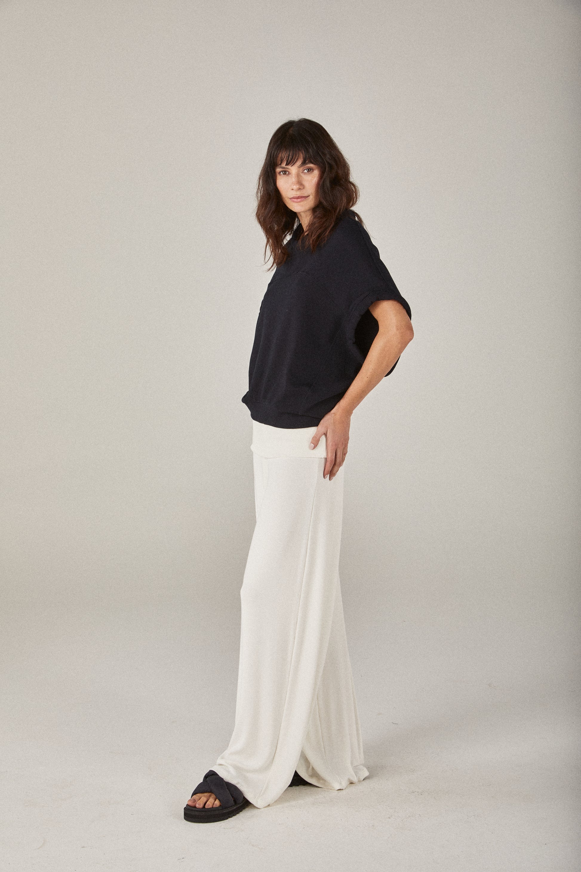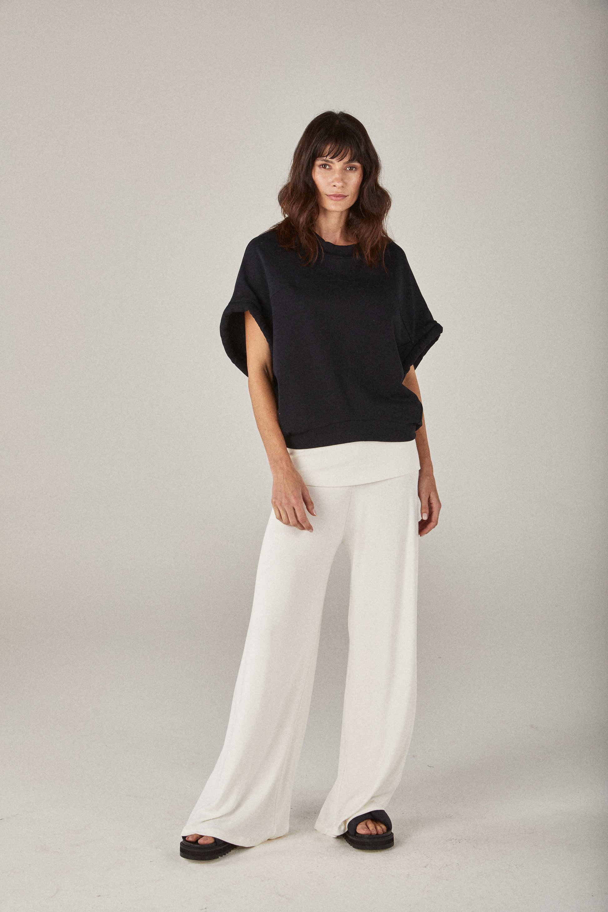 A calça pantalona com pala é confeccionada em algodão de malha, garantindo um toque macio e confortável ao vestir. Seu caimento fluido valoriza a silhueta com elegância. Ideal para momentos de relaxamento com estilo ou como parte de um look homewear sofisticado e cheio de personalidade.