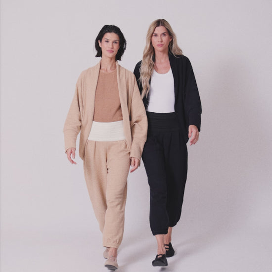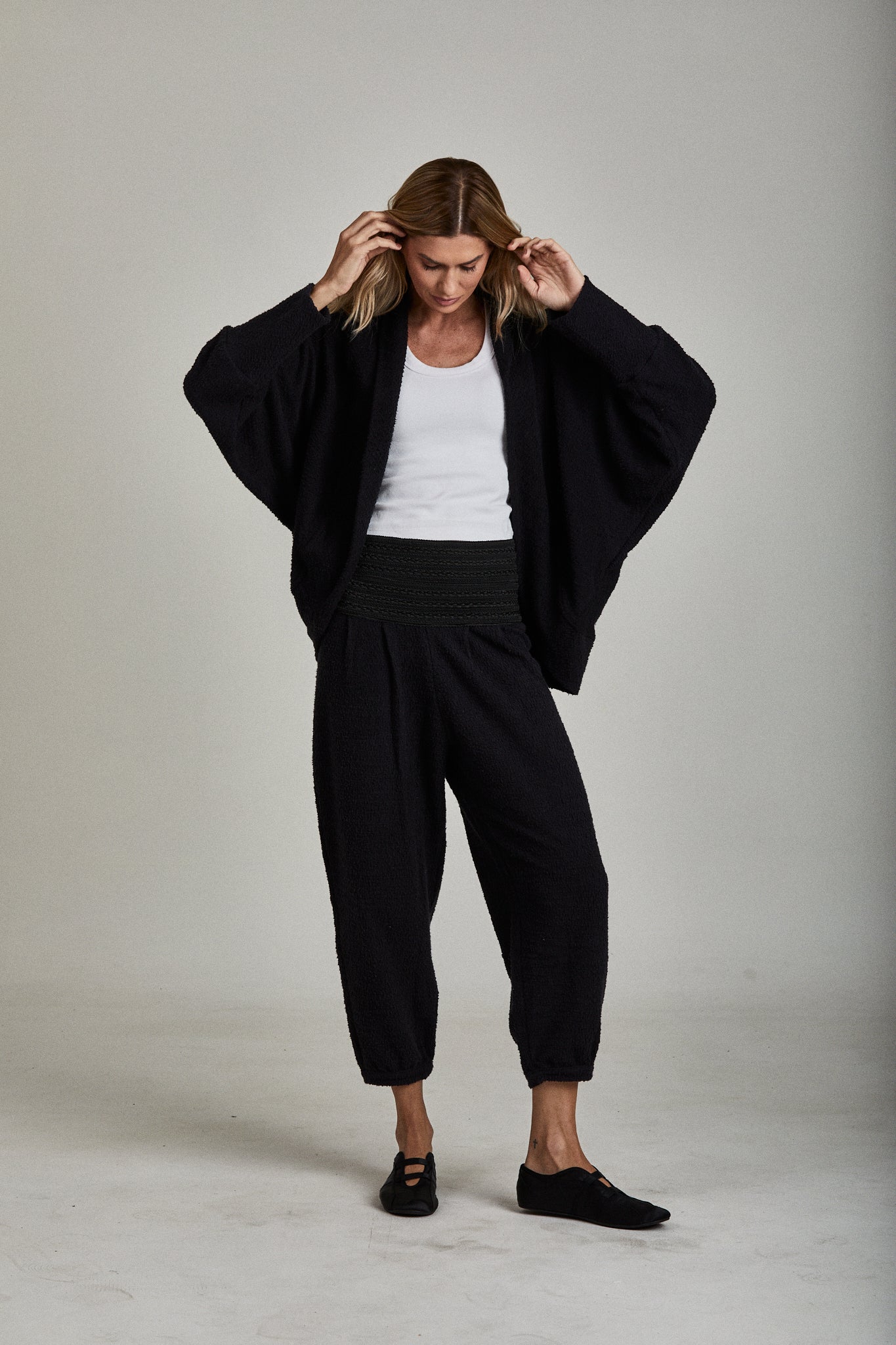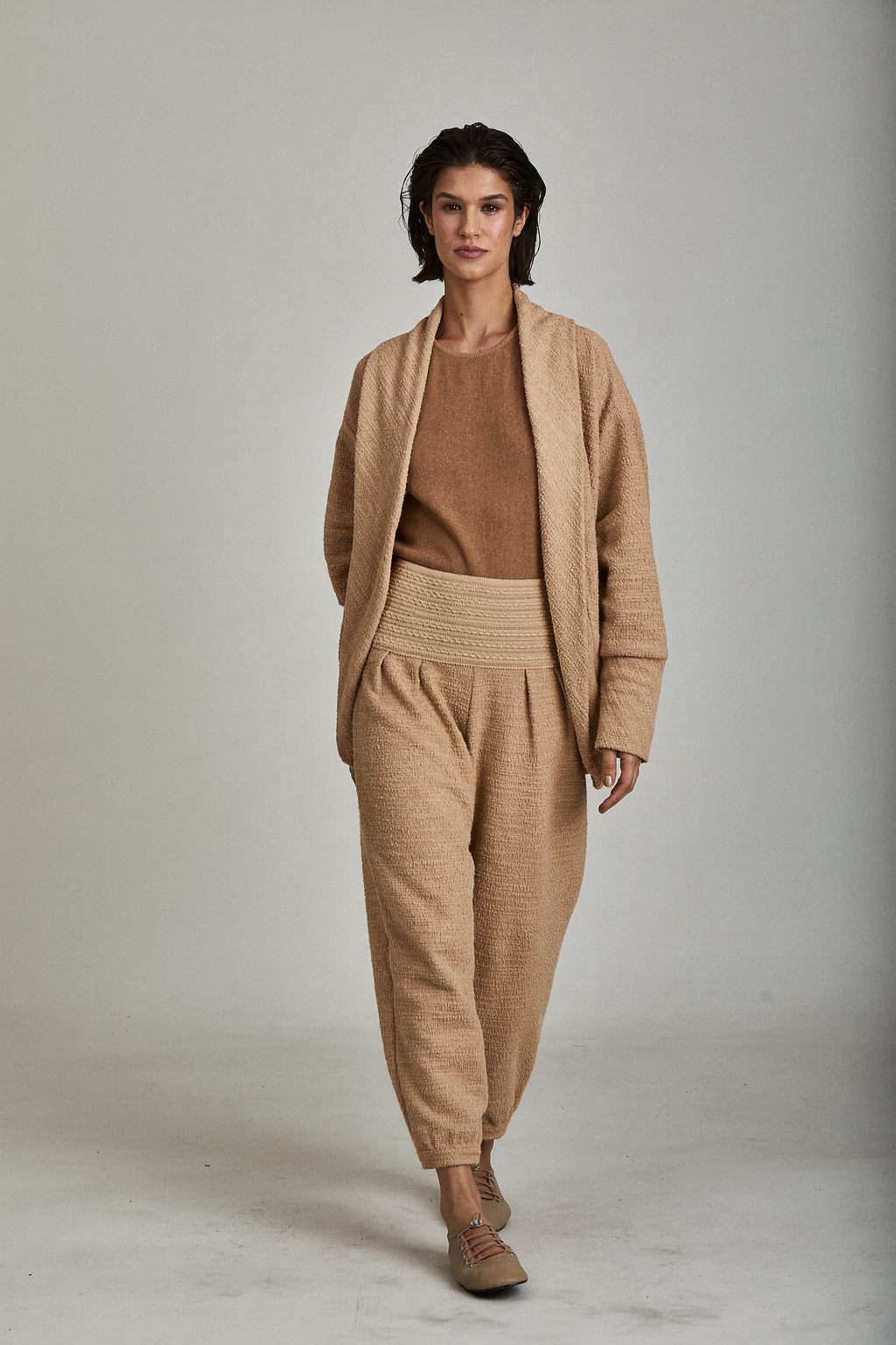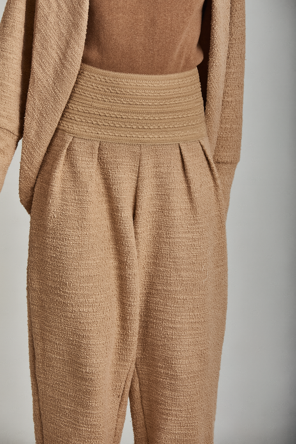 Calça de cintura alta com elástico trabalhado, também em tecido Boucle texturizado. Oferece conforto e praticidade com um toque de moda despojada, sendo uma peça versátil para coincidências casuais e estilosas.