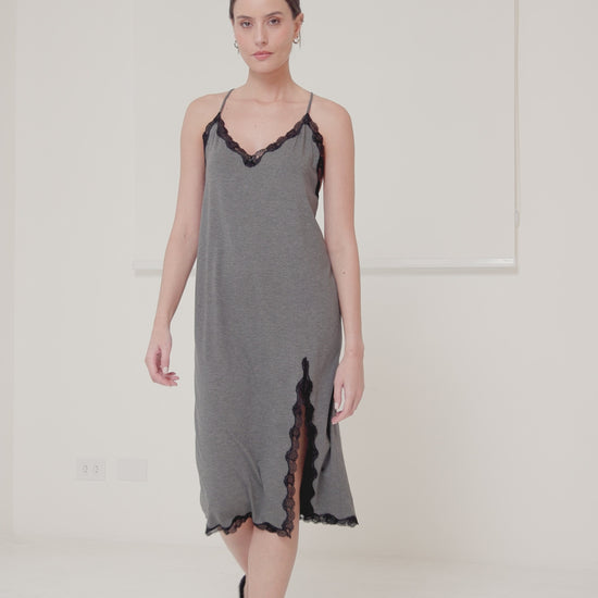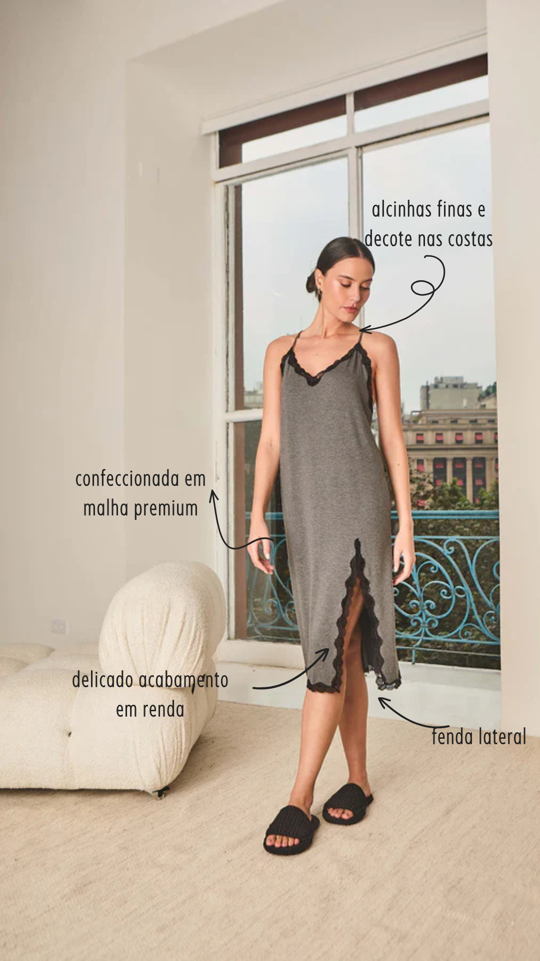 O modelo midi de alça apresenta um delicado acabamento em renda, que realça o decote e a barra com sofisticação. A fenda lateral adiciona sensualidade na medida certa, enquanto o decote nas costas torna a peça ainda mais feminina e encantadora.