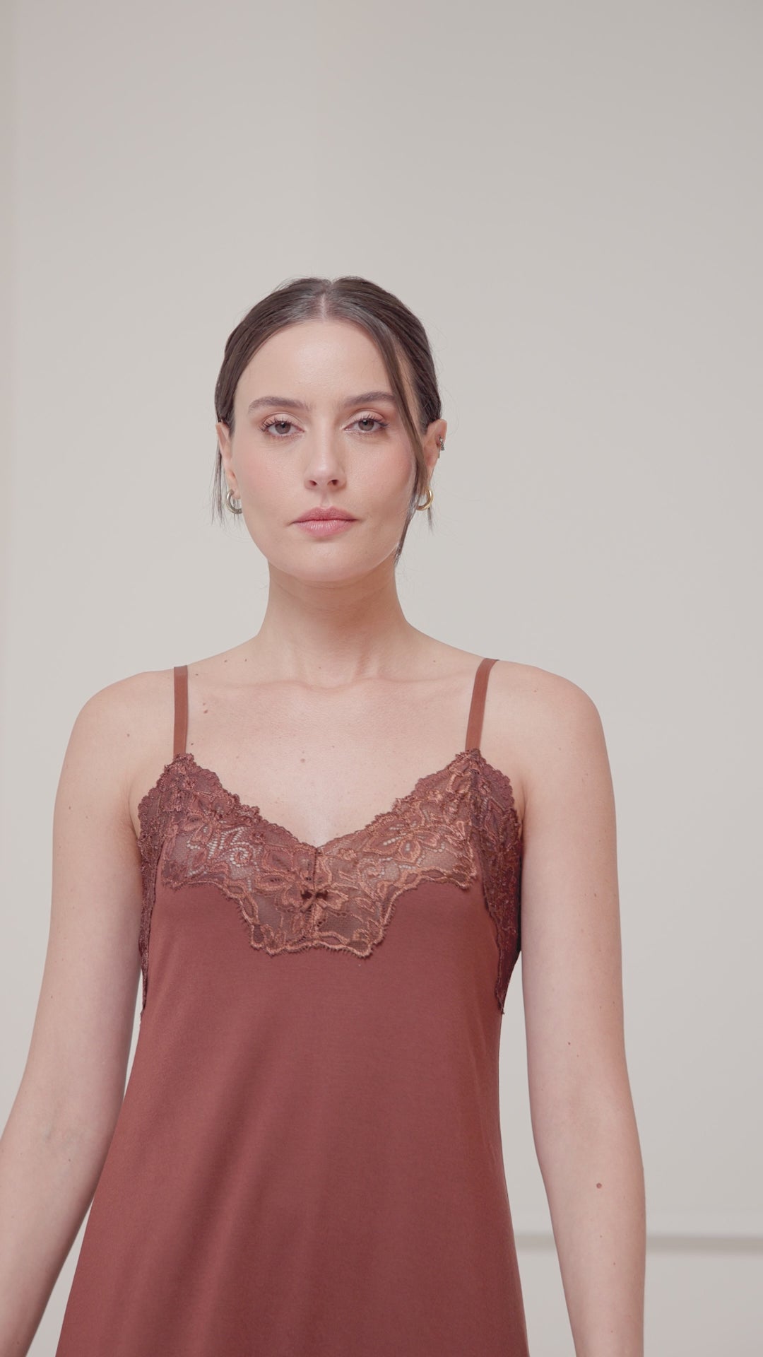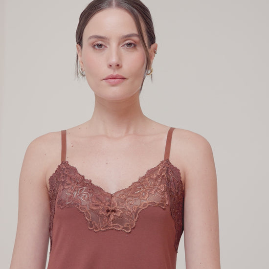 Uma camisola delicada, com alças finas e ajustáveis, em tecido suave que envolve o corpo com leveza. O decote em renda adiciona um toque de feminilidade, criando o equilíbrio perfeito entre sensualidade e conforto para noites especiais.