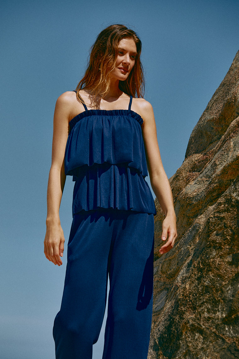 Conjunto composto por blusa de alças finas com babados horizontais e calça de cintura elástica de pernas largas. Ambos em tecido micro canelado. Com caimento leve e fluido , ele une movimento e sofisticação.
