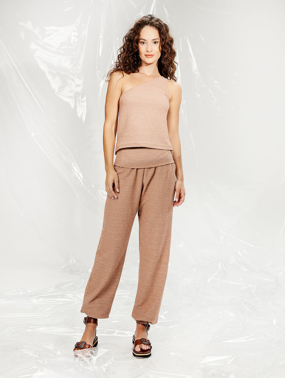 A blusa de um ombro só valoriza a silhueta com charme e feminilidade, criando um destaque fashion que transforma a peça em protagonista do look. A calça conta com pala na cintura, proporcionando melhor ajuste e conforto, além de modelagem levemente saruel, que garante caimento moderno e despojado. Os punhos na barra finalizam o design com praticidade e estilo, oferecendo liberdade de movimento e um visual atual.