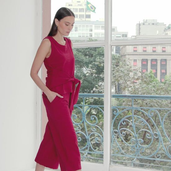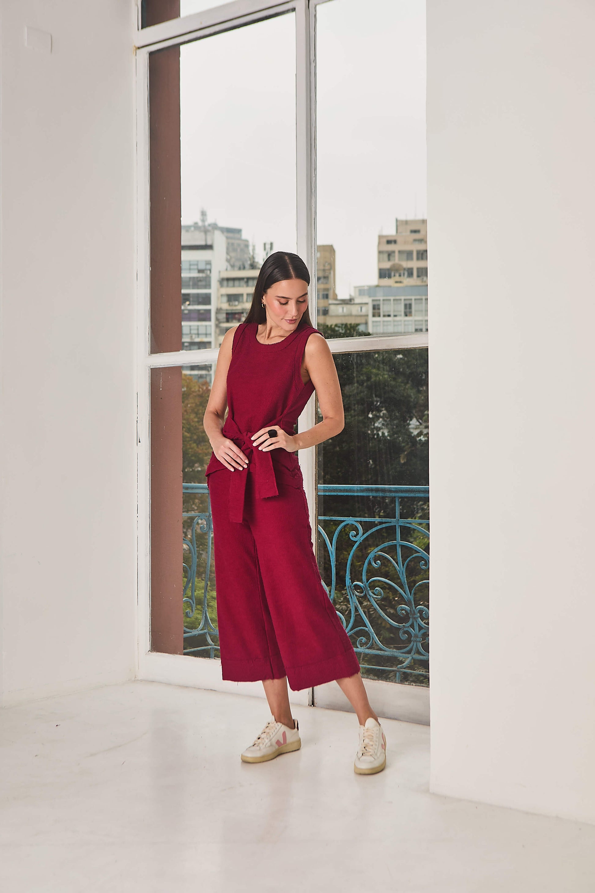 A calça pantacourt completa o visual com bolsos laterais funcionais e acabamento em corte a fio na barra, detalhe que adiciona um toque contemporâneo e despojado.