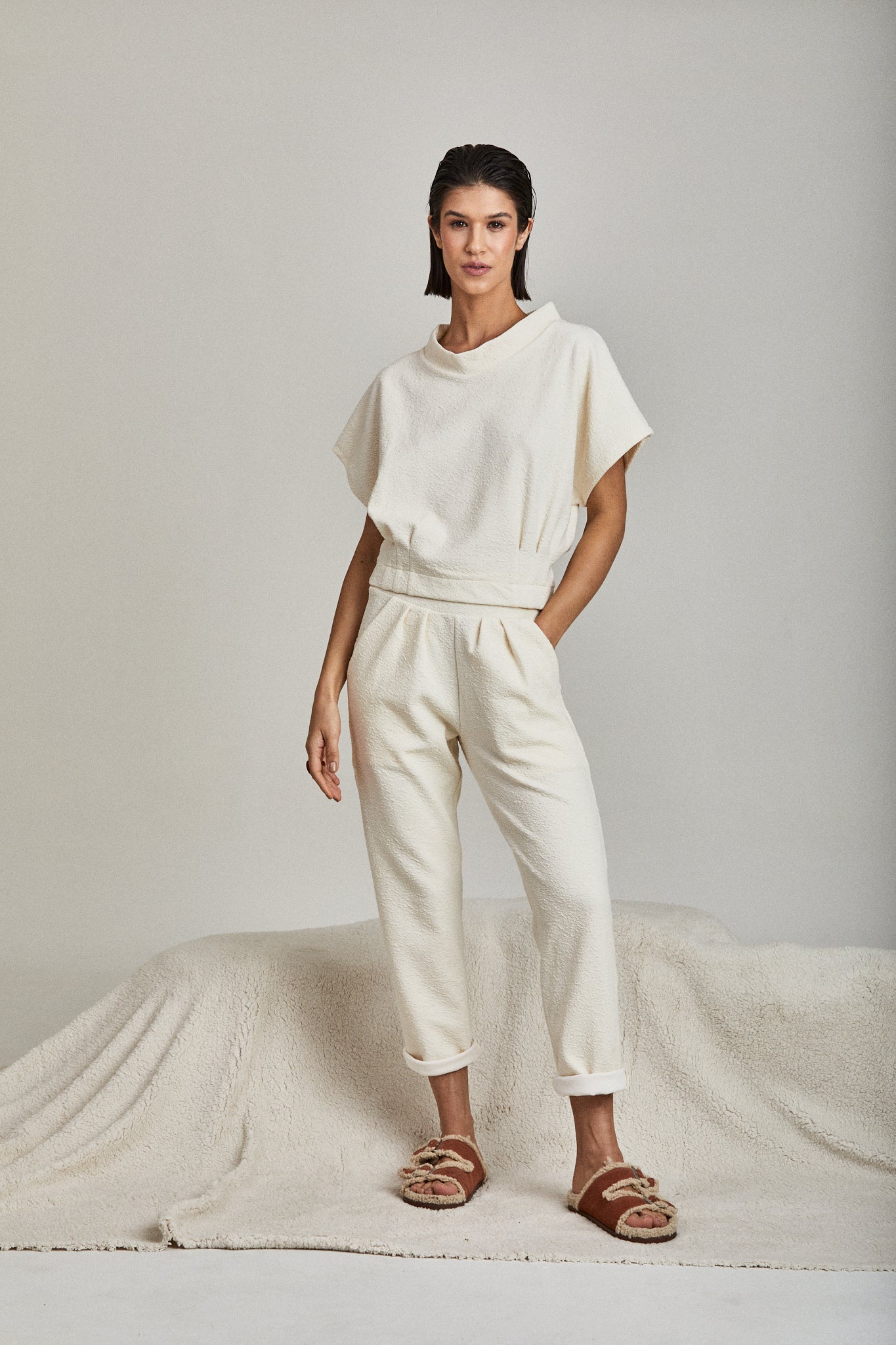Esse conjunto é a tradução perfeita de casual! Confeccionado em malha macia e estruturada, ele traz um toque de sofisticação nos detalhes: blusa de manga curta com gola delicada e preguinhas sutis que valorizam a silhueta de forma leve e feminina.