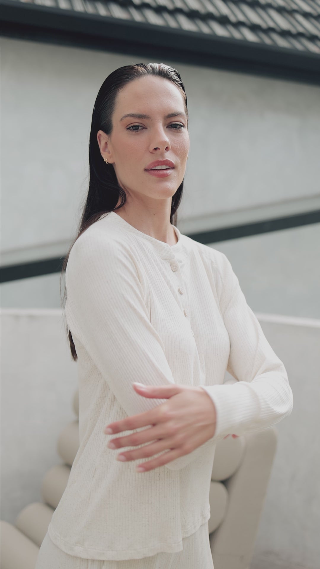 O Pijama Brenda combina charme e aconchego em um design moderno e sofisticado. Feito em malha canelada, um tecido macio e flexível, proporciona um toque suave e um caimento impecável.