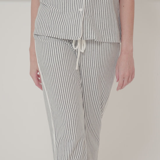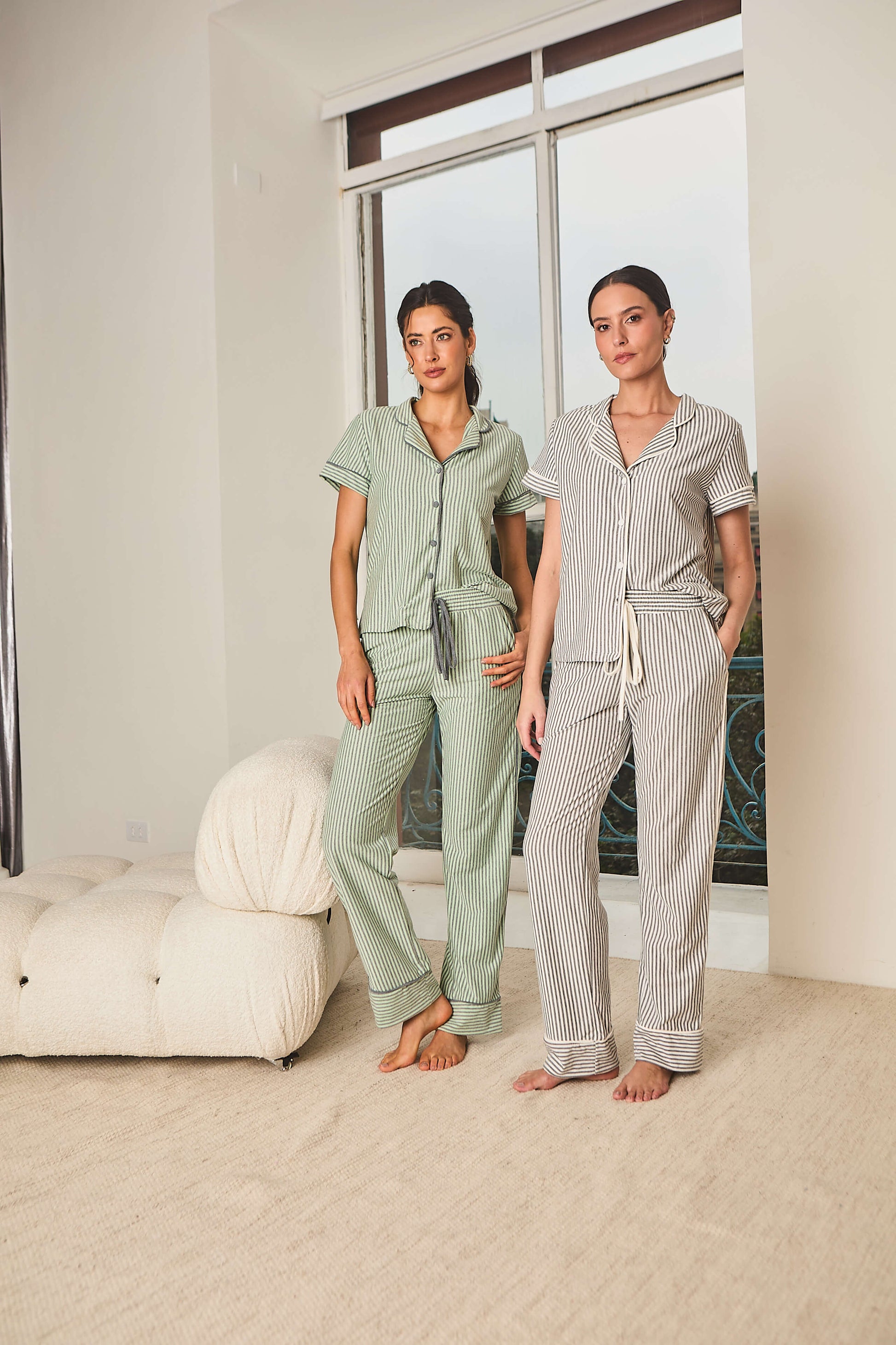 A parte superior traz o tradicional design americano: gola dobrada, fechamento frontal por botões e mangas curtas, que garantem praticidade e um visual atemporal. Já a calça reta com cós confortável e amarração ajustável oferece caimento impecável e liberdade de movimento. As listras delicadas e o acabamento contrastante elevam o conjunto com um toque sofisticado e moderno.