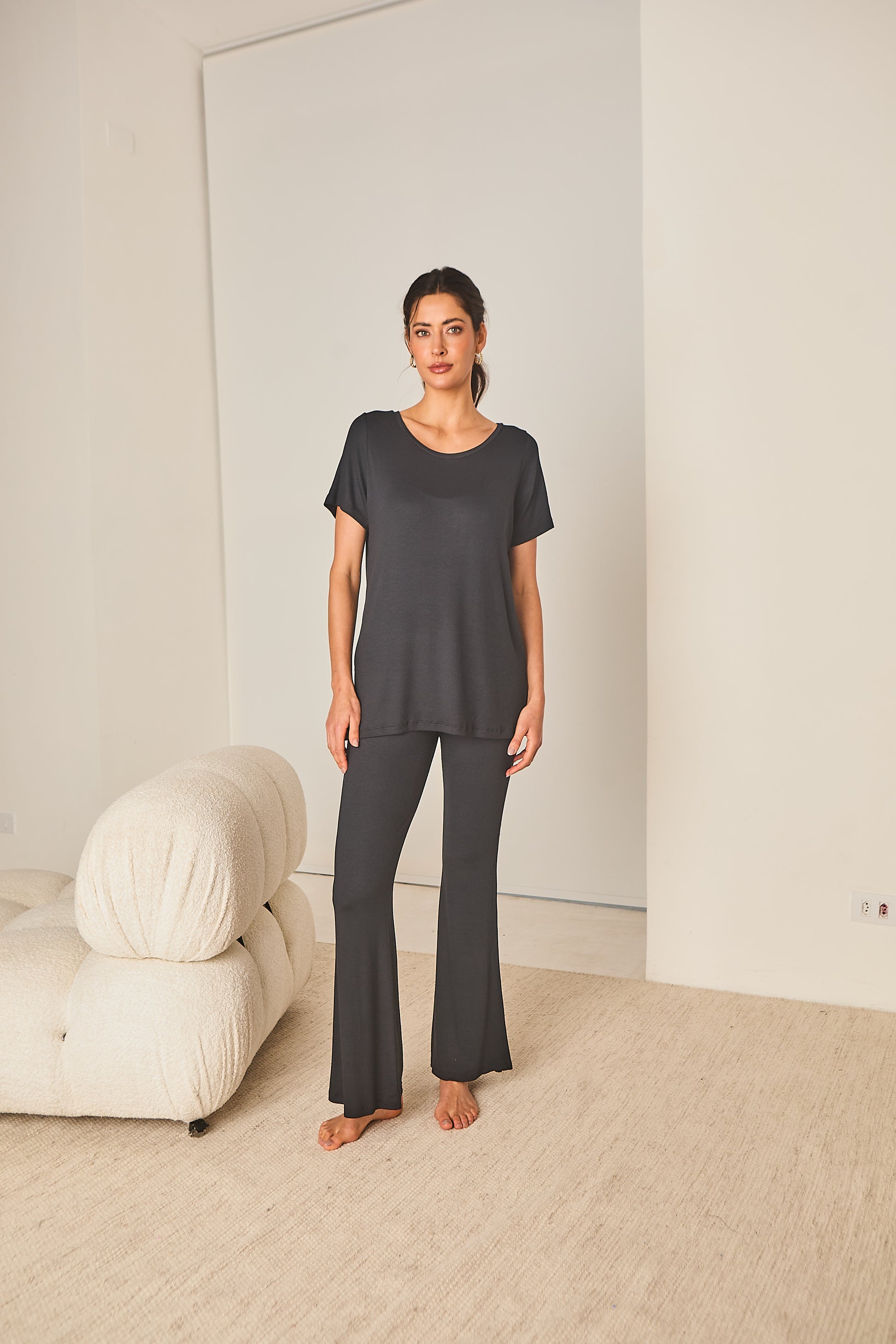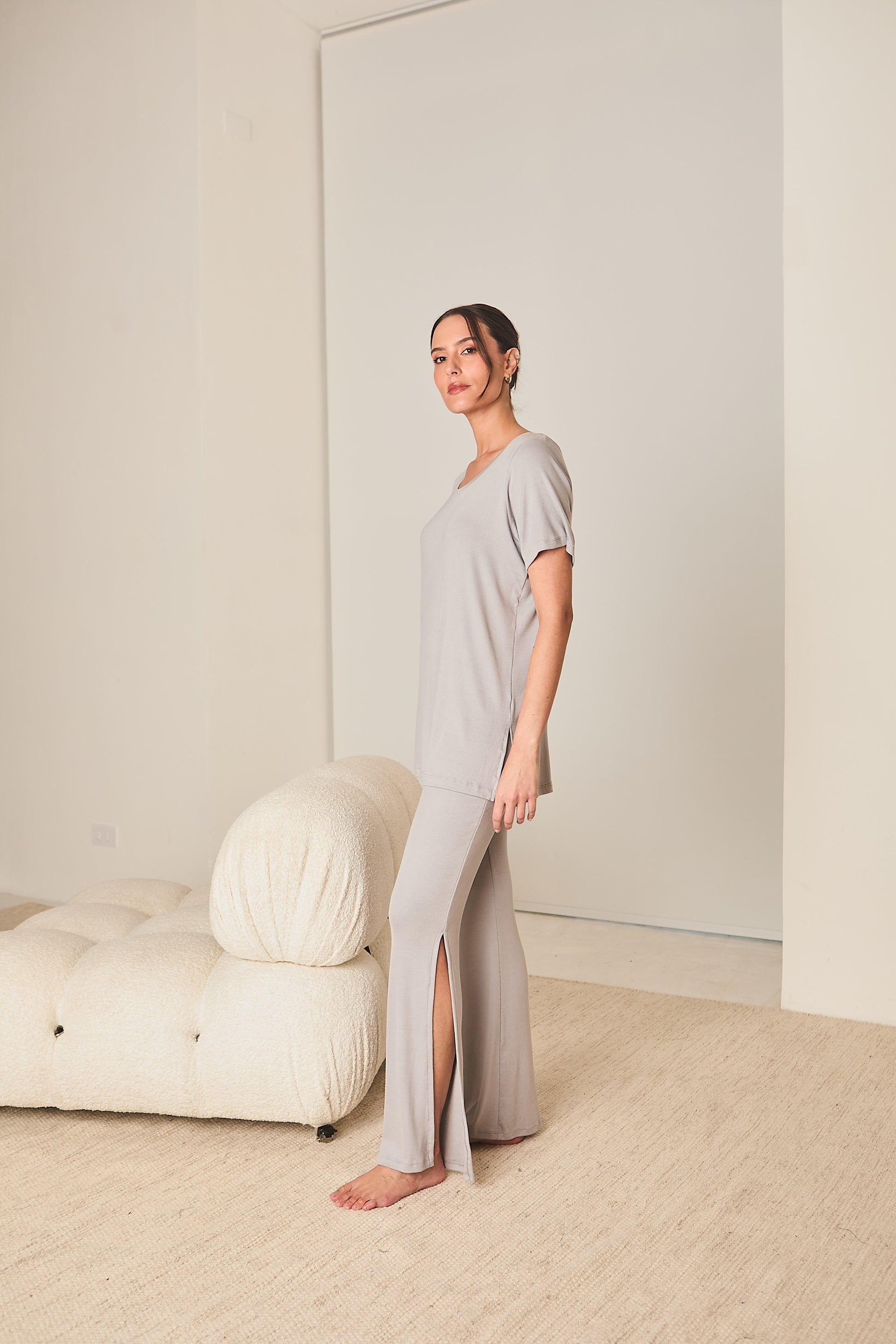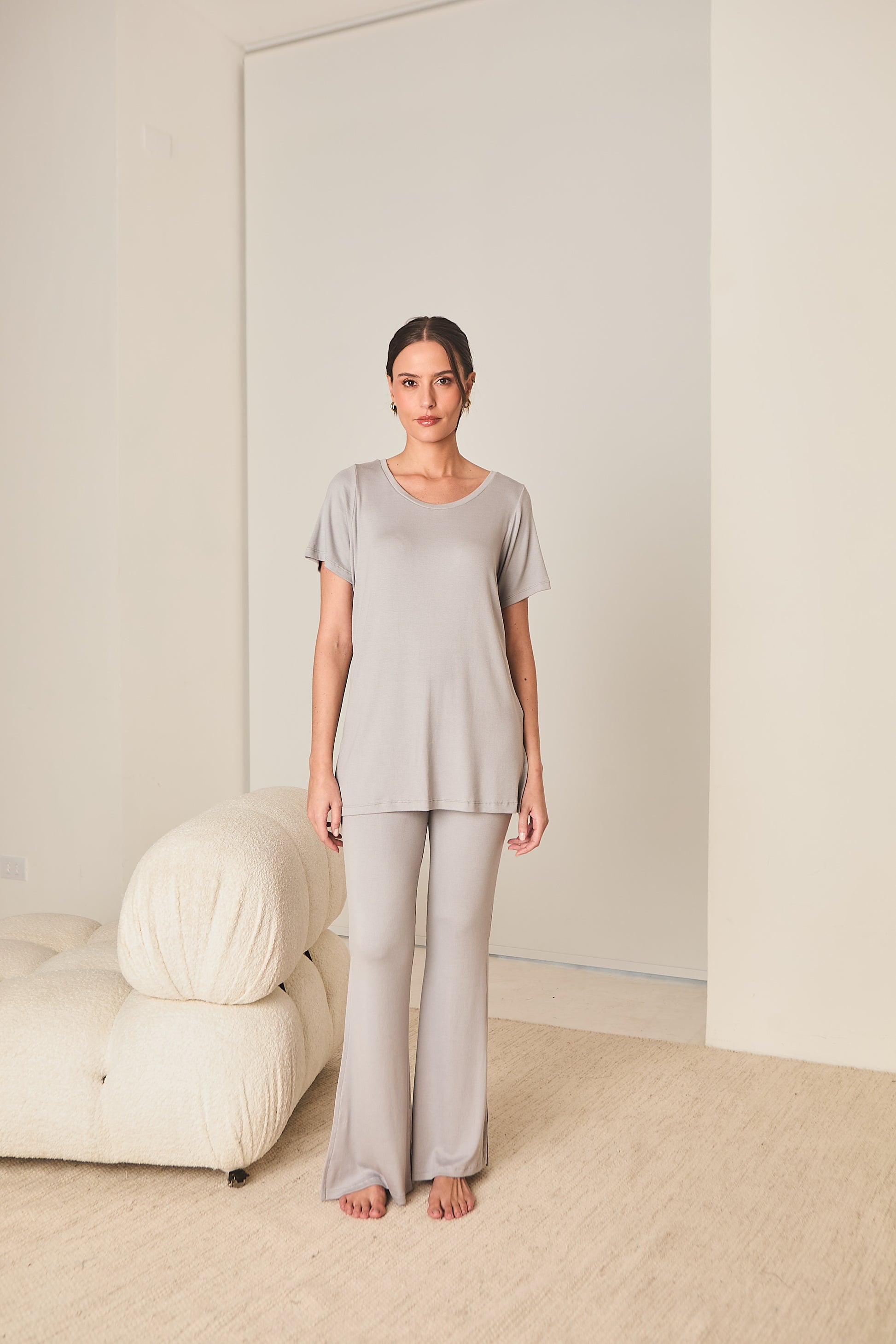 O conjunto é composto por um blusão soltinho, que garante liberdade de movimentos, e uma calça bailarina com fenda lateral nas pernas, que traz um caimento fluido e um charme extra ao visual. O design moderno une praticidade e elegância, tornando o Alecrim ideal tanto para noites aconchegantes quanto para momentos de descanso com estilo.