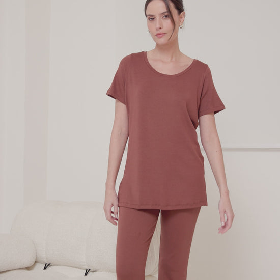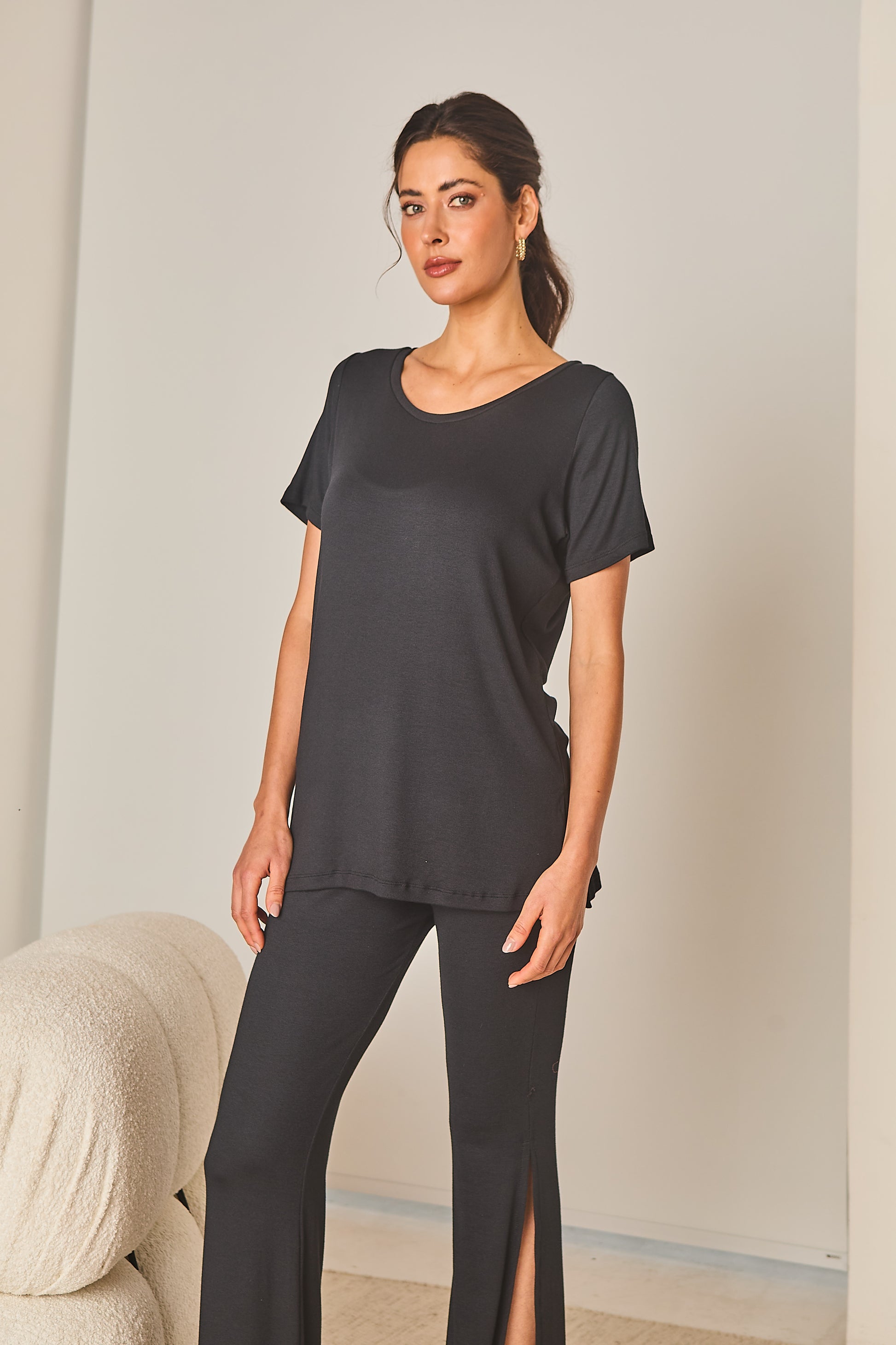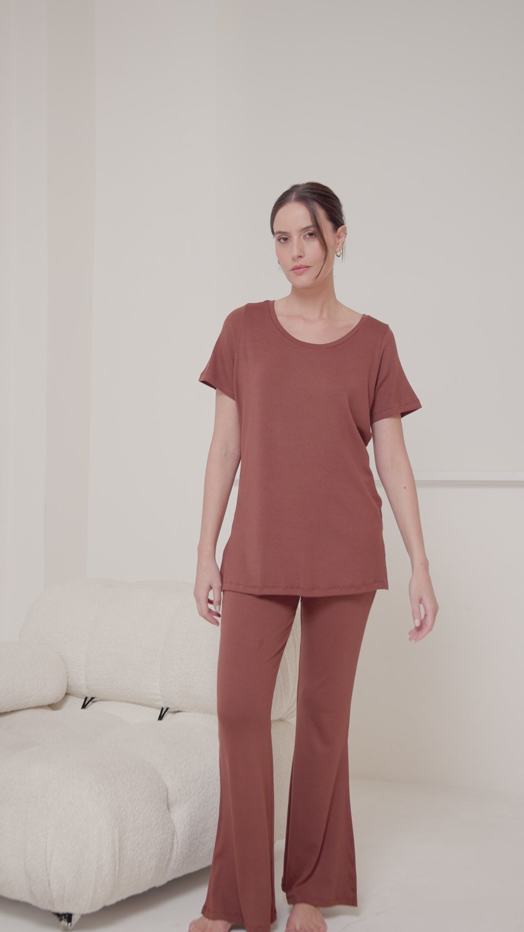 O conjunto é composto por um blusão soltinho, que garante liberdade de movimentos, e uma calça bailarina com fenda lateral nas pernas, que traz um caimento fluido e um charme extra ao visual. O design moderno une praticidade e elegância, tornando o Alecrim ideal tanto para noites aconchegantes quanto para momentos de descanso com estilo.