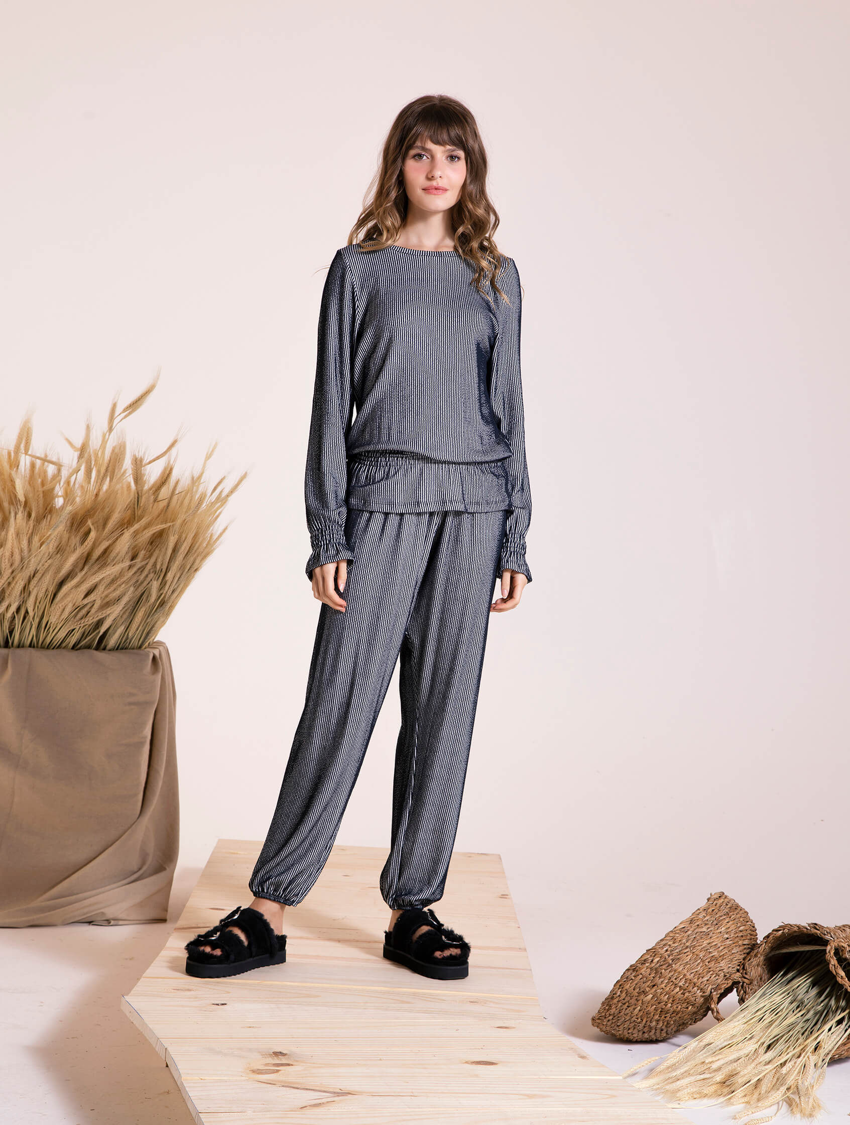 O Pijama Wilmara é a combinação ideal de conforto e estilo. Confeccionado em malha canelada, ele oferece um toque suave e aconchegante para uma noite de descanso perfeita. A blusa apresenta ajuste na cintura e punhos, proporcionando um caimento ajustado e elegante, enquanto a calça larga com elástico na cintura e punhos oferece liberdade de movimento e um visual descontraído. Versátil e sofisticado, o Pijama Wilmara é perfeito para quem busca praticidade e charme em um único conjunto.