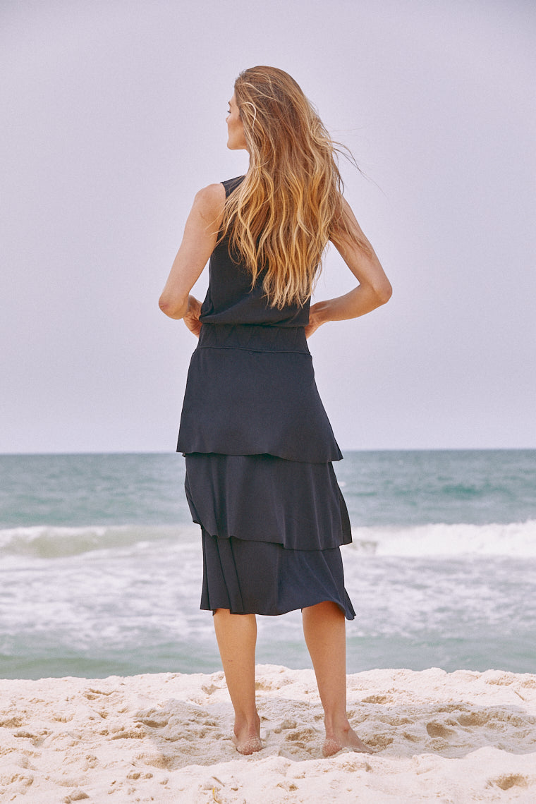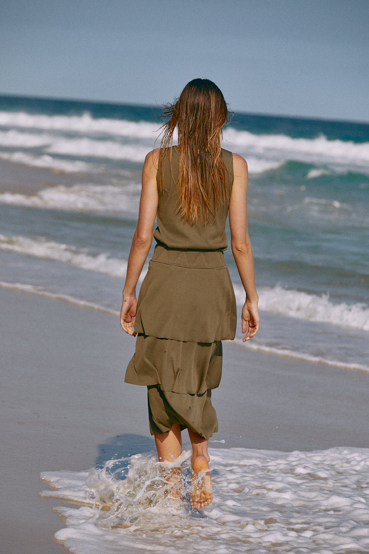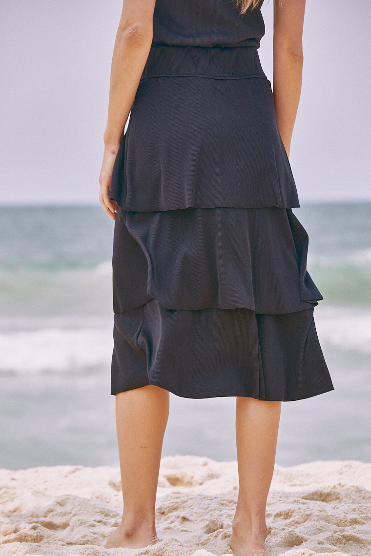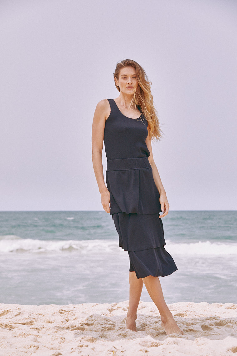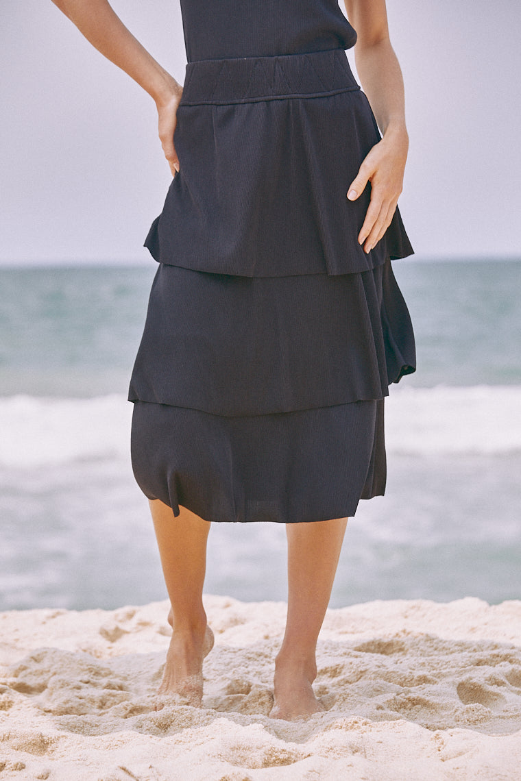Saia midi com design sofisticado e minimalista. Possui três camadas sobrepostas que conferem movimento e fluidez ao visual. A modelagem confortável e descomplicada, é adequada para ocasiões mais casuais ou pode servir de base para produções mais elegantes.