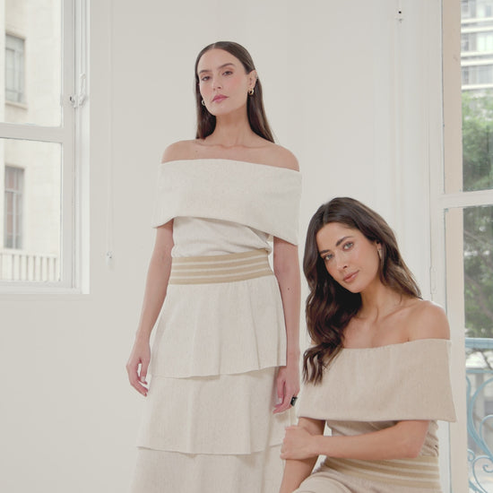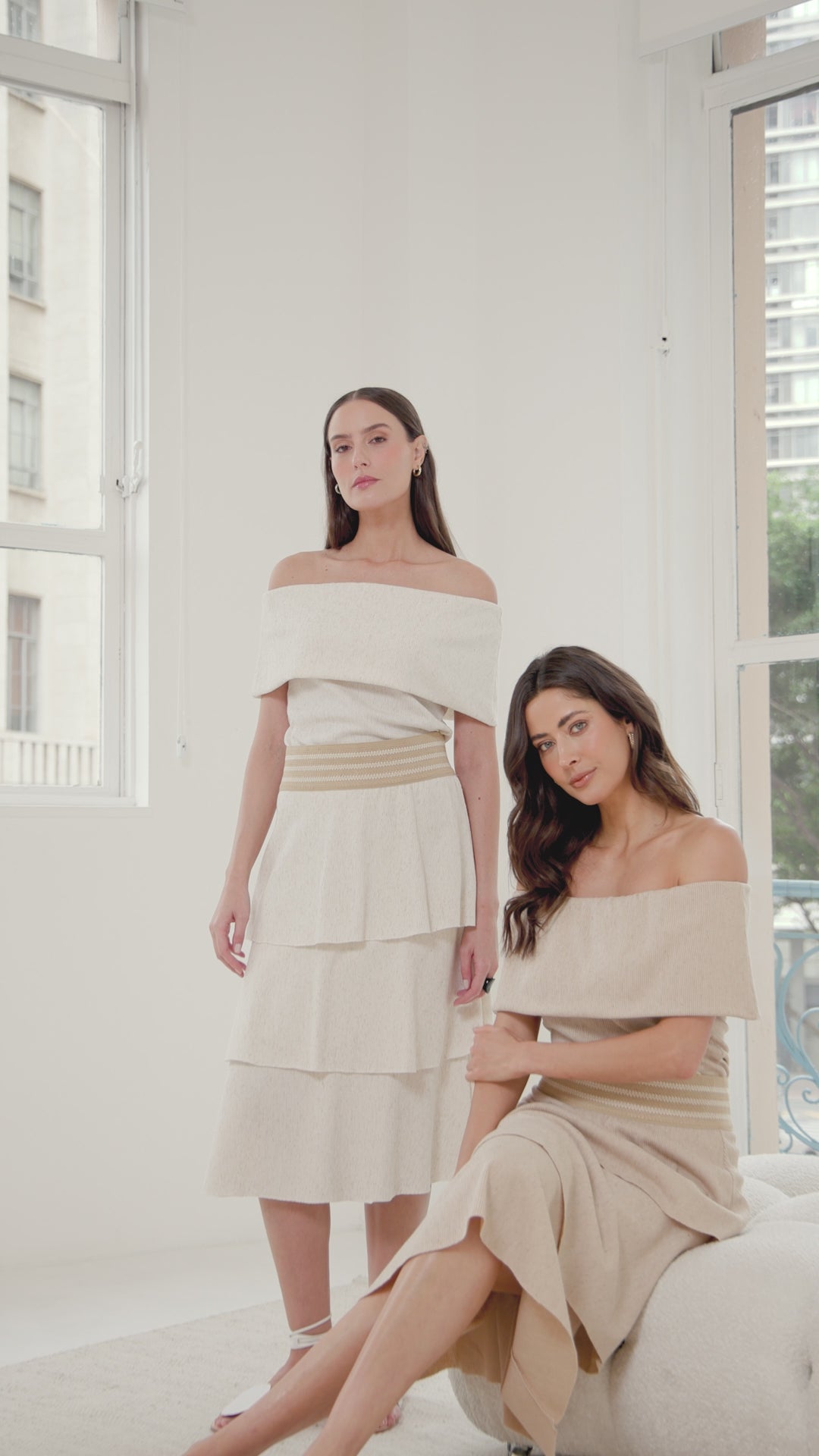 Seu design em camadas assimétricas confere leveza, movimento e profundidade ao look, criando uma silhueta fluida e ao mesmo tempo estruturada. A cintura apresenta uma faixa trabalhada, que valoriza a região com destaque sutil e harmonioso, elevando ainda mais o acabamento da peça.